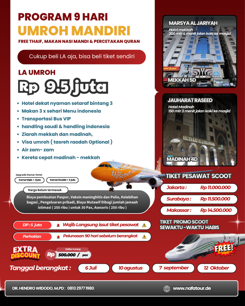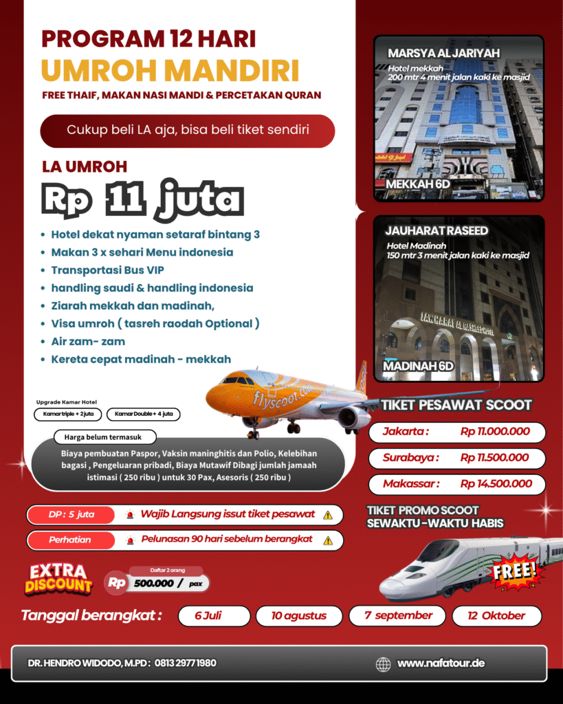 Umroh Mandiri merupakan suatu program untuk membantu kamu agar bisa umroh dengan budget terbatas, namun tetap bisa beribadah dengan nyaman. Cukup cari dan beli tiket pesawat susuai tanggal keinginanmu dan sisa nya serahkan sama Nafa Tour untuk membantu mu!